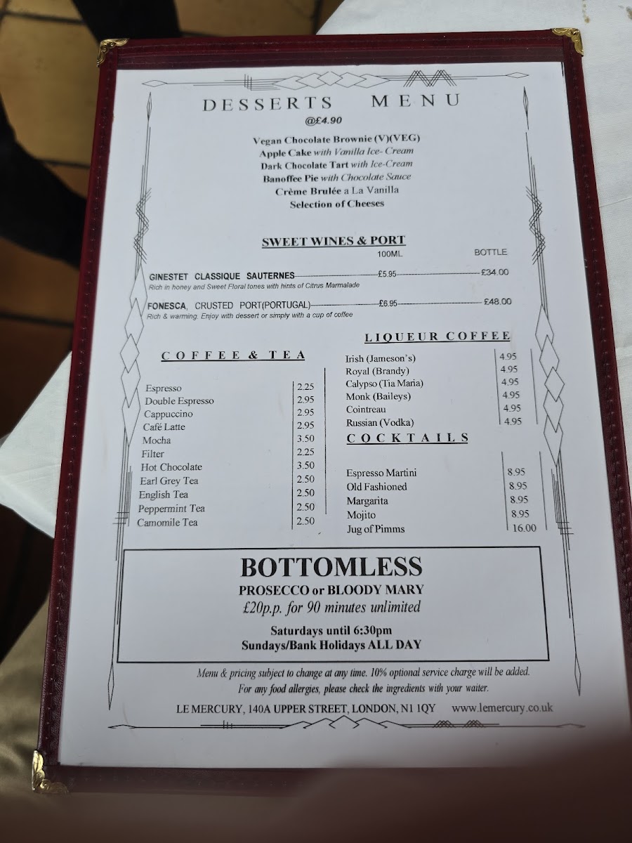 Le Mercury also does not fall short in its dessert offerings. The Tarte Tatin is a highlight, with its perfectly caramelized apples and buttery pastry, making it a sweet ending to an already exceptional meal.