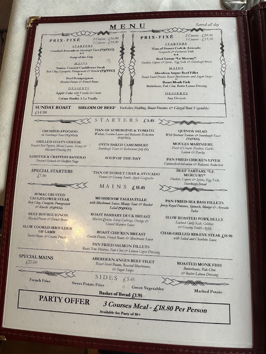 The Le Mercury Menu features a range of beautifully crafted dishes that emphasize fresh ingredients and bold flavors. Among the standout options is the Confit Duck Leg, which is tender, flavorful, and perfectly complemented by a rich, aromatic sauce. For seafood lovers, the Grilled Sea Bass is another must-try, expertly prepared with a delicate crispy skin and paired with seasonal vegetables that enhance its freshness.